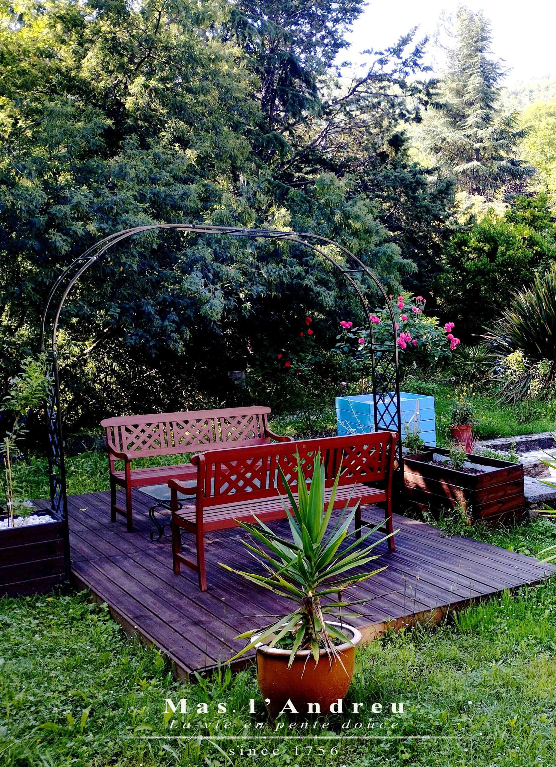 - une terrasse avec bancs et table basse